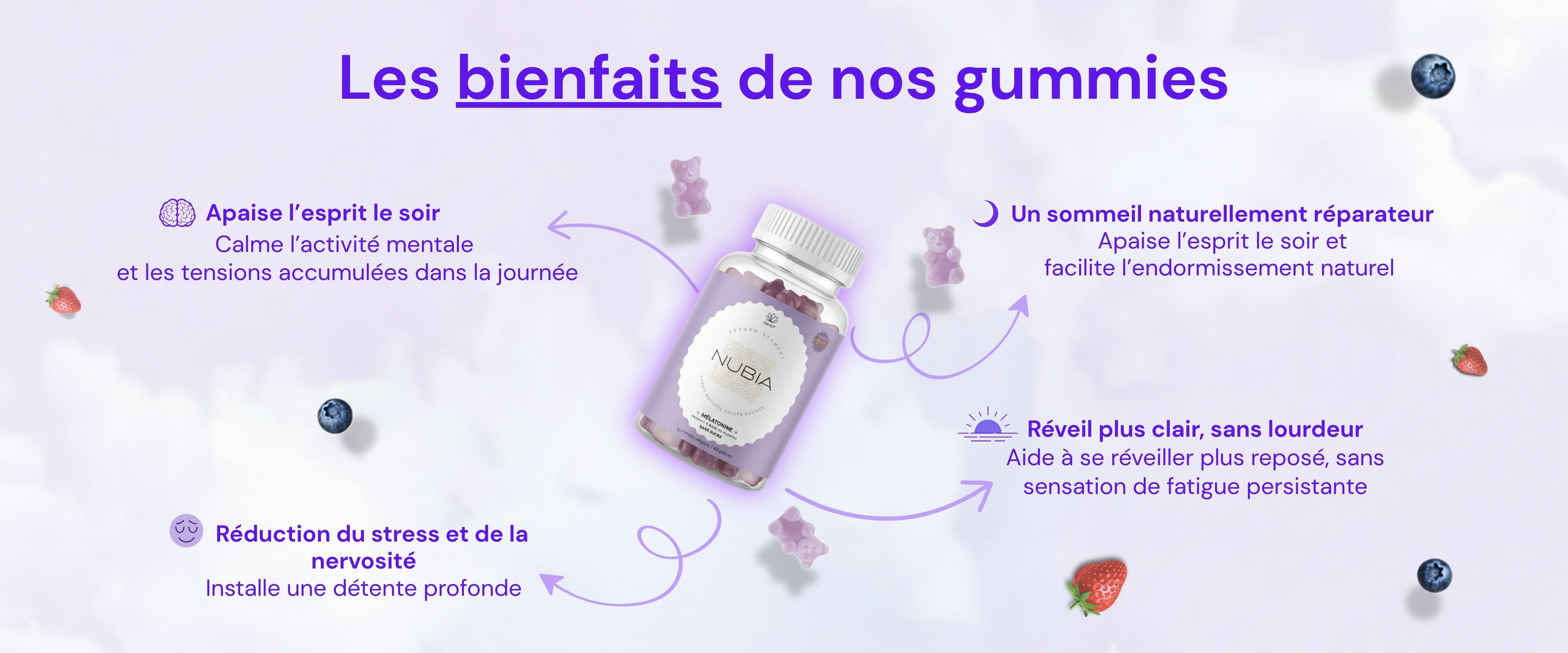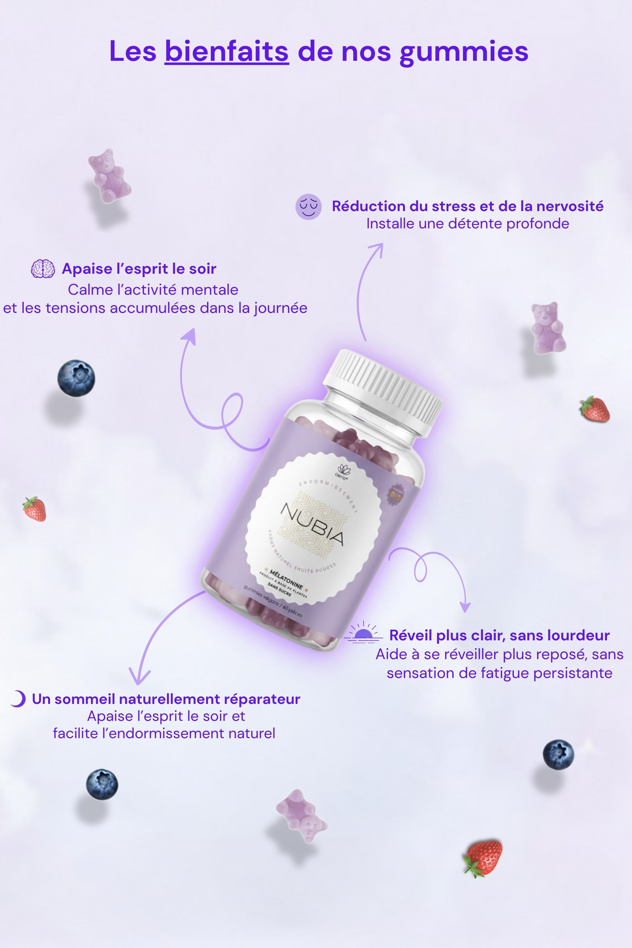 Moins de 1€ par nuit pour apaiser l’esprit le soir et faciliter l’endormissement naturellement avec Nubia™, des gummies sommeil pensés pour des nuits plus sereines. Une formule naturelle à base de plantes et micronutriments, qui agit sur les vraies causes des troubles du sommeil.