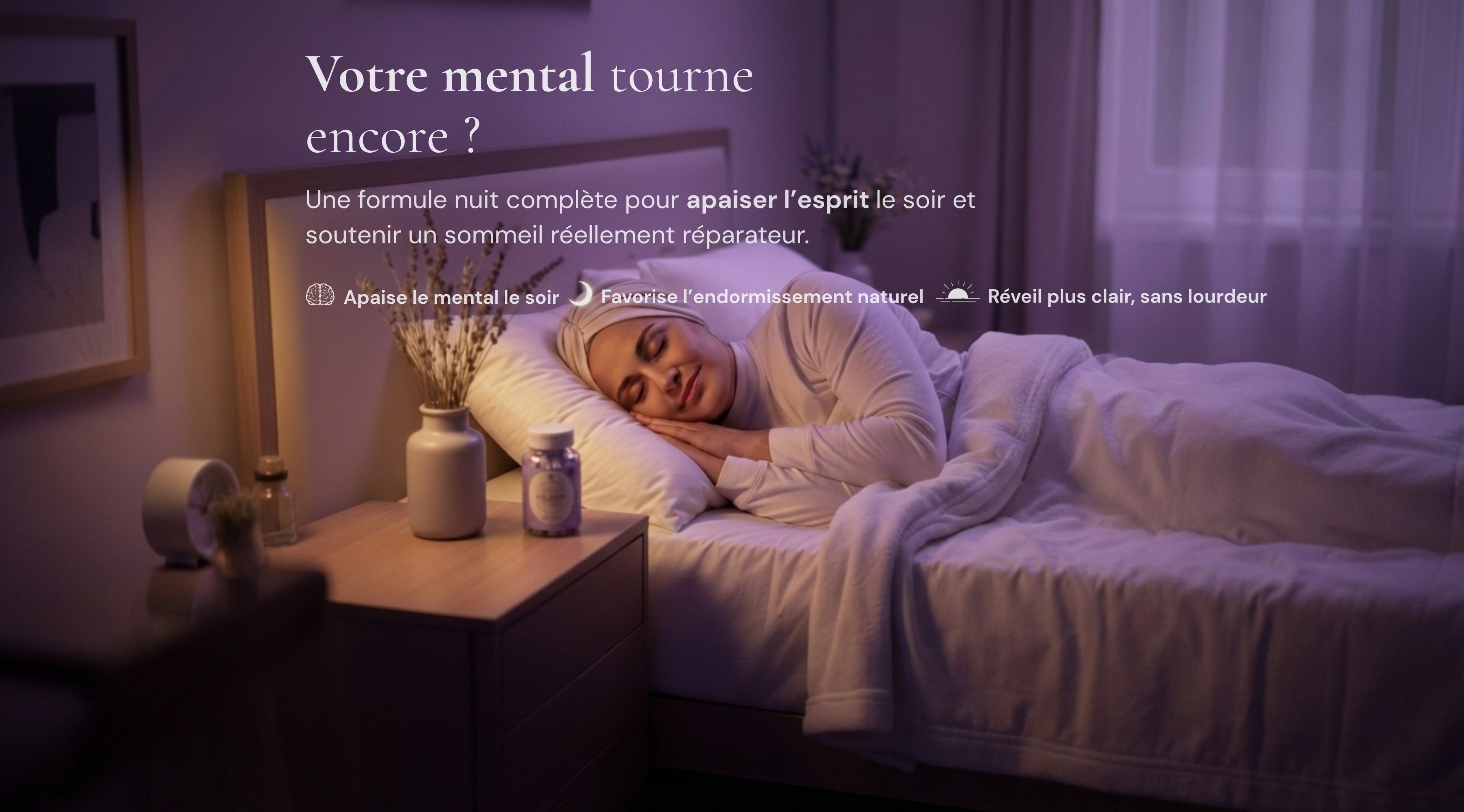 Quand le corps est fatigué mais que le mental continue de tourner, l’endormissement devient difficile. La L-théanine et les plantes apaisantes de Nubia aident à favoriser la relaxation et à préparer naturellement le sommeil. Une formule pensée pour calmer les pensées du soir et faciliter un coucher plus serein.